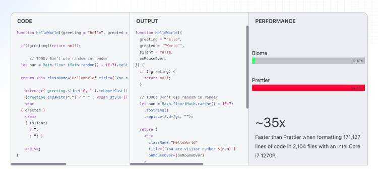 Biome 是一款适用于网络项目的便捷工具。它具有快速的 JavaScript、TypeScript、JSX、JSON 格式化器和衬入器,并支持 97% 的 Prettier 功能。你可以轻松地将它与 VSCode 集成,使其能够在你编写代码时实时格式化和衬垫你的代码,帮助你提高代码质量。