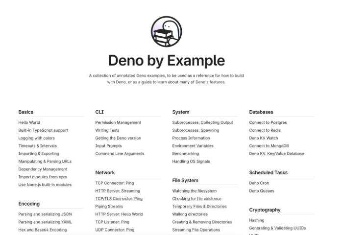 Deno by Examples 提供了使用 Deno 的实用代码示例,从基础任务到高级任务,如设置 HTTP 服务器、处理 JSON、处理表单以及使用 JSX 进行服务器端渲染。每个示例都包含清晰、可执行的代码片段,帮助你快速掌握 Deno。
