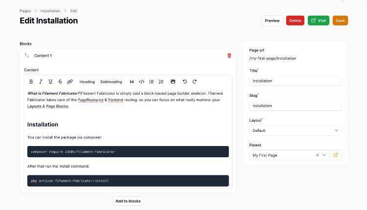 Fabricator 是 FilamentPHP 的一个插件,可帮助您在 Filament 应用程序中创建基于块的动态页面布局。它允许您通过友好的用户界面轻松创建和管理内容块,无需大量技术技能即可轻松创建复杂的页面或布局。