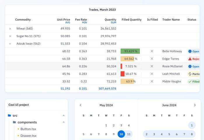 MUI X 包含一系列高级 React 组件,如 DataGrid、Charts 以及 Date & Time Pickers。它可以帮助您高效地组织和显示大量数据,并提供排序、筛选等选项,甚至还能让您将数据导出到 Excel。它是构建复杂数据驱动型应用程序的完美库。