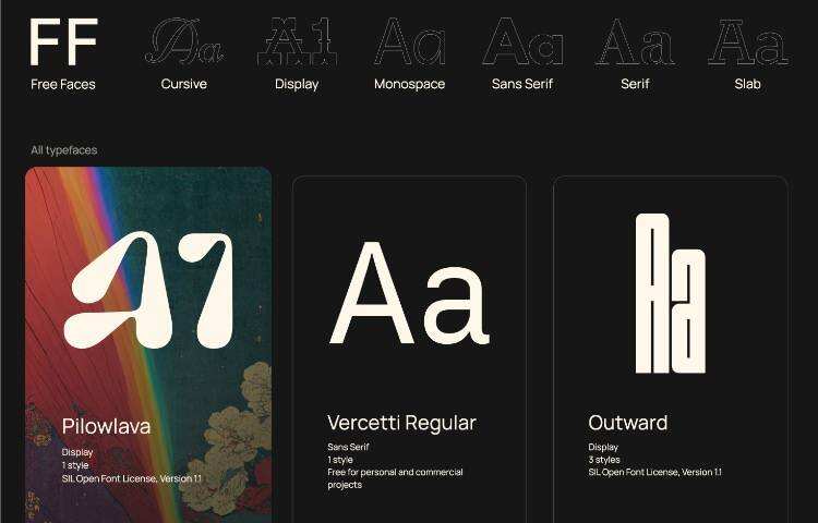 FreeFaces Gallery 是一个以各种免费许可证提供的字体的精选集。它提供了一系列字体,包括草书字体、显示字体、等宽字体、无衬线字体、衬线字体和粗衬线字体。