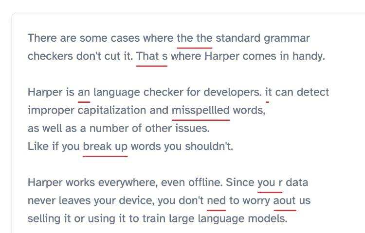 Harper 是一款专为开发人员设计的轻量级、注重隐私的英语语法检查工具。它在本地处理一切以确保隐私,目前支持美式英语,并计划通过社区贡献增加其他语言。你可以使用 harper-ls、Obsidian 插件或 Zed 插件将 Harper 集成到你的环境中。对于希望提高写作水平的开发人员来说,这是一个很好的工具。
