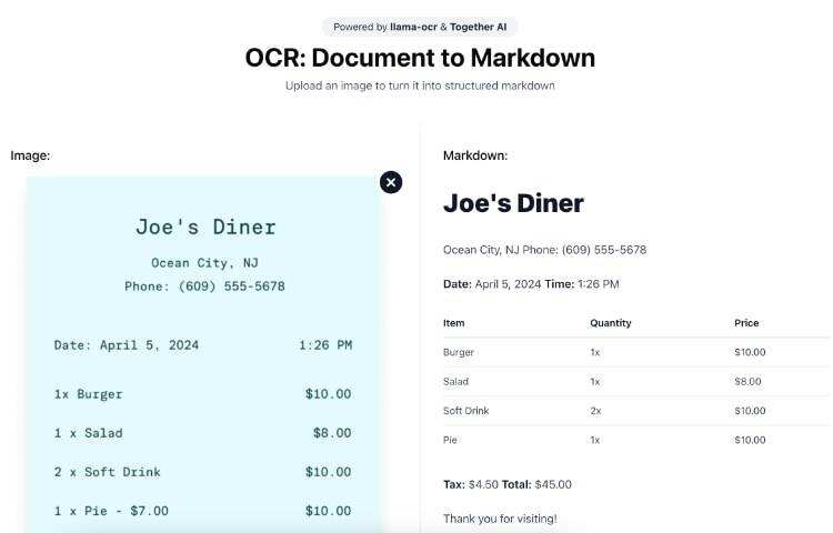 LlamaOCR 是一款开源光学字符识别 (OCR) 工具,可将文档图像转换为结构化 Markdown 格式,非常适合处理表格等复杂布局和混合格式文件。它使用 Llama 3.2 视觉模型从 PDF 和图像中可靠地提取文本。它可以通过 npm 软件包轻松集成。如果您正在寻找一款功能强大的 OCR 工具,LlamaOCR 将是您的不二之选。