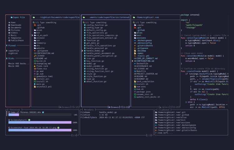 Superfile 是一款基于终端的文件管理器,兼顾了简洁的设计和强大的文件管理功能。它包括可定制的选项,如热键、主题颜色和边框样式,以满足你的喜好。它支持多面板,允许你同时打开多个目录,让你更轻松地整理和移动文件,而无需不断切换视图。它是终端强大用户的绝佳工具。