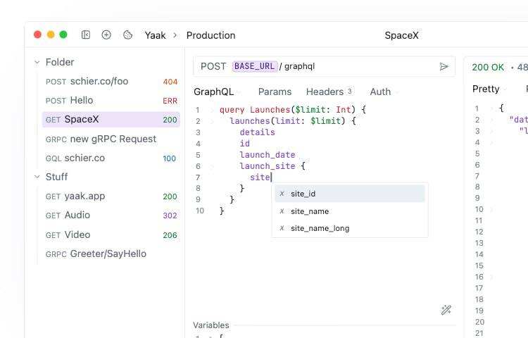 Yaak 是一款开源桌面应用程序,用于管理 REST、GraphQL 和 gRPC 等应用程序接口。它包括多环境支持、变量管理以及从 Postman 等工具导入的功能。它是一款面向开发人员的简单而强大的 API 客户端。