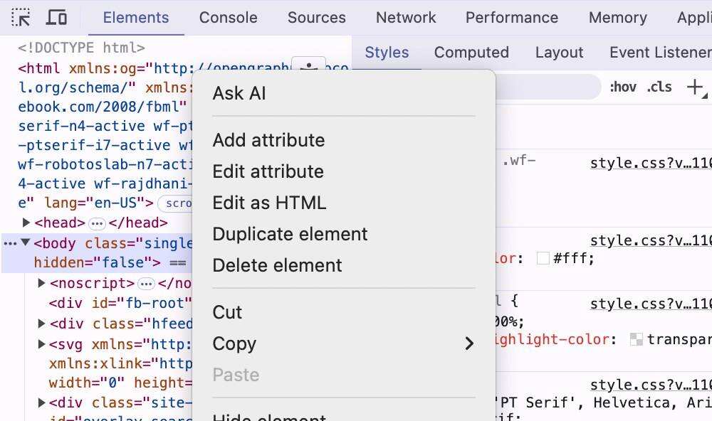 - 右键单击 DOM 树中的元素,然后选择“Ask AI”: 这是针对特定元素的更快捷选项。