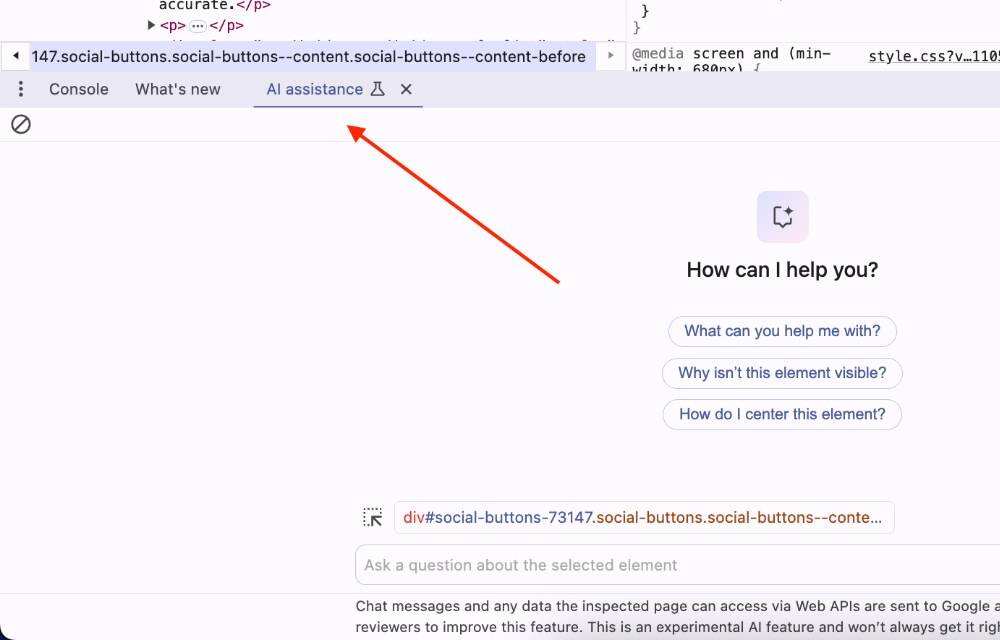 目前,AI 辅助提供了几种有用的功能,包括控制台洞察,它可以帮助你更好地理解控制台中的错误和警告。它还提供一般帮助,允许你提出有关页面、元素等方面的问题。