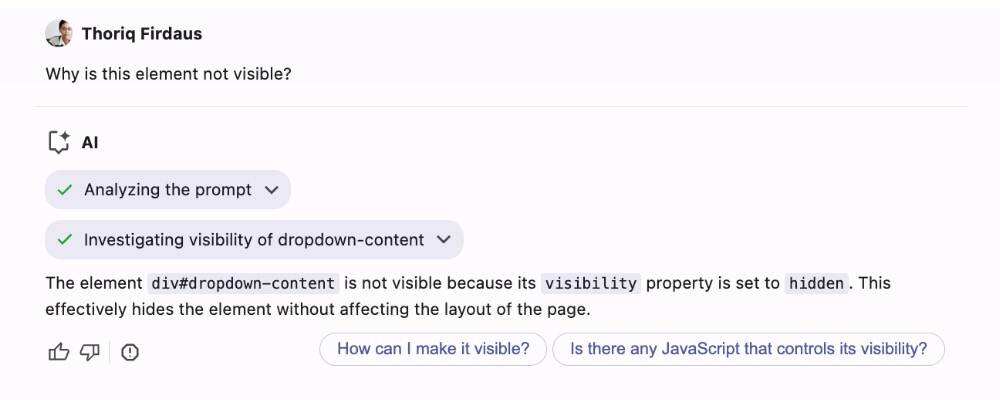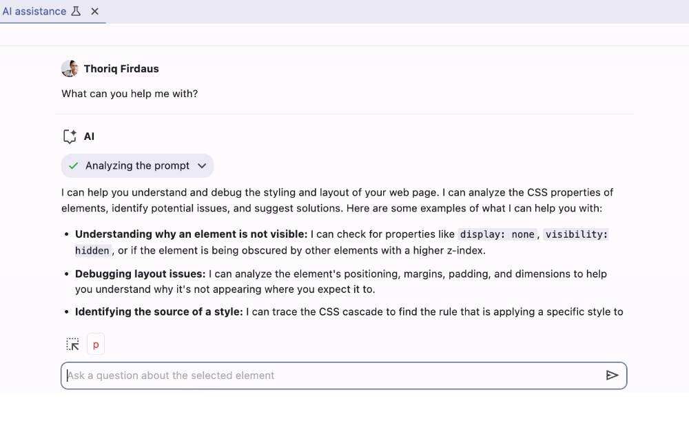 它可以协助完成各种任务,例如解释元素不可见的原因、排除布局问题,甚至对 CSS 提出改进建议!
