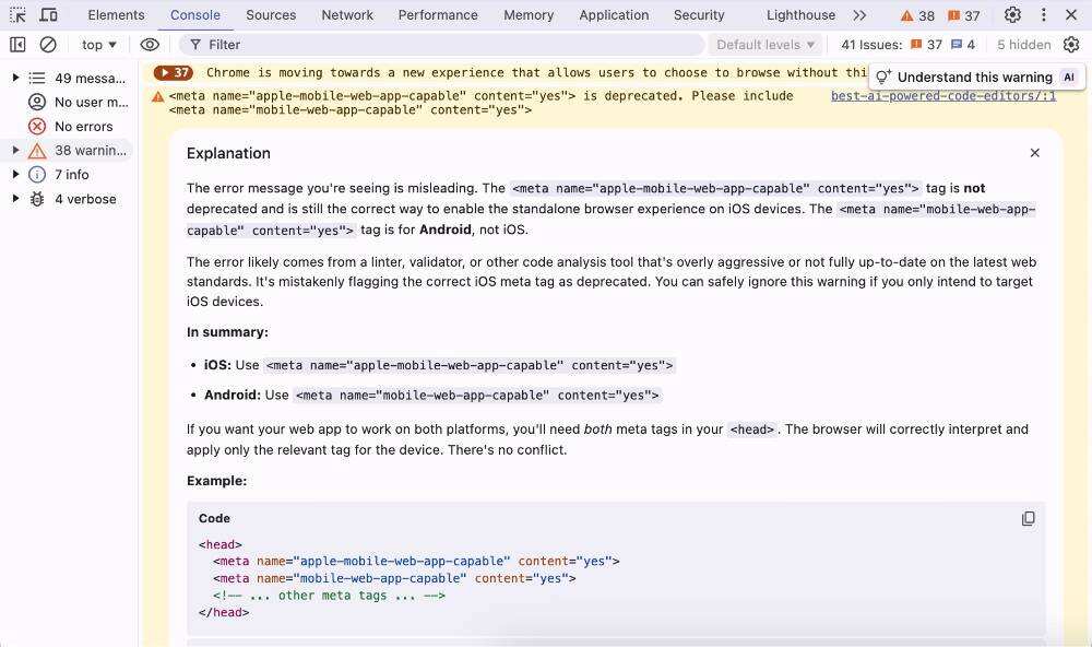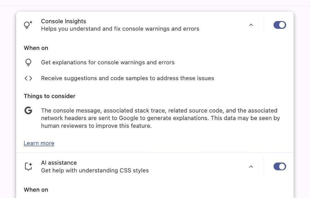 AI 辅助工具最有用的一点就是它的调试功能。例如,如果您在控制台中发现警告,并且启用了人工智能辅助功能,Chrome 浏览器将在每条警告信息旁边显示“Understand this warning
