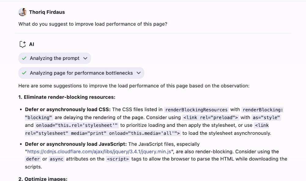 除了 HTML、CSS 和调试之外,人工智能协助还可以帮助优化页面性能和搜索引擎优化。例如,您可以问:What do you suggest to improve the load performance of this page?