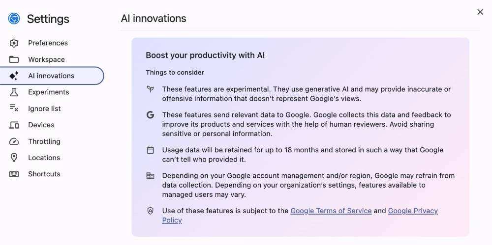 首先,确保您的 Chrome 浏览器是最新的,并且已启用人工智能功能。为此,请打开 Chrome 浏览器开发者工具并导航至“设置”(见下面的截图)。