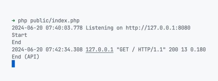 该命令使用 ReactPHP Socket 组件支持的 PHP 内置服务器启动本地服务器。无需 Nginx 或 Apache。服务器将在http://127.0.0.1:8080 上运行,并显示 “Hello World!”。