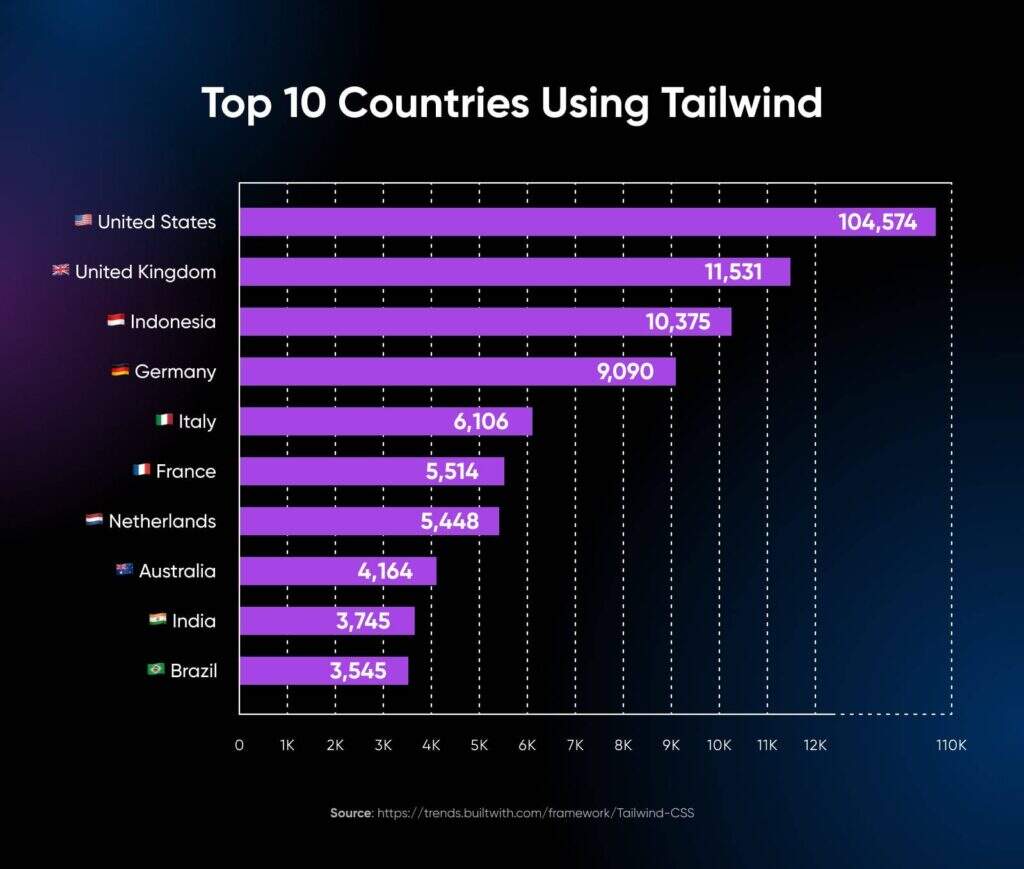 根据 BuiltWith 的技术堆栈数据,仅在美国就有超过 10 万个网站使用 Tailwind 构建用户界面,英国、印度尼西亚、德国和其他国家也是该库的前 10 大用户。