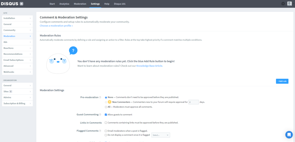 您还可以在 Disqus 面板 “Settings” 选项卡下左侧导航窗格中的 “Moderation” 菜单中配置审核规则。