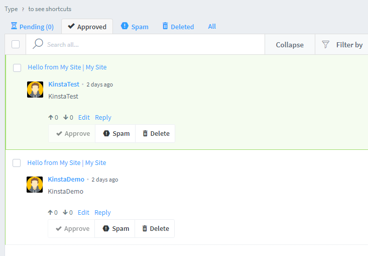 通过检查多条评论,您可以在审核面板上执行批量操作(批准、删除评论并将其标记为垃圾评论)。或者,您也可以在展开的评论视图中单独对它们进行审核。