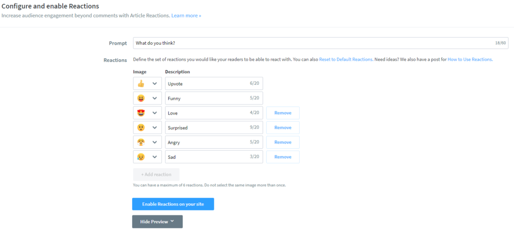 通过在网站上启用 “Reactions”,可以提高受众的参与度。根据您的偏好自定义这些反应。
