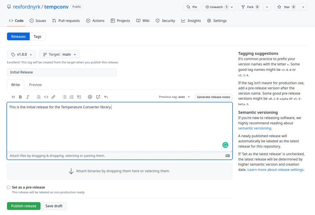 有了您的代码,您就可以在您的 repo 中创建一个带有版本号的库发布版本,这样其他开发者就可以跟踪您的稳定版和重要更新。