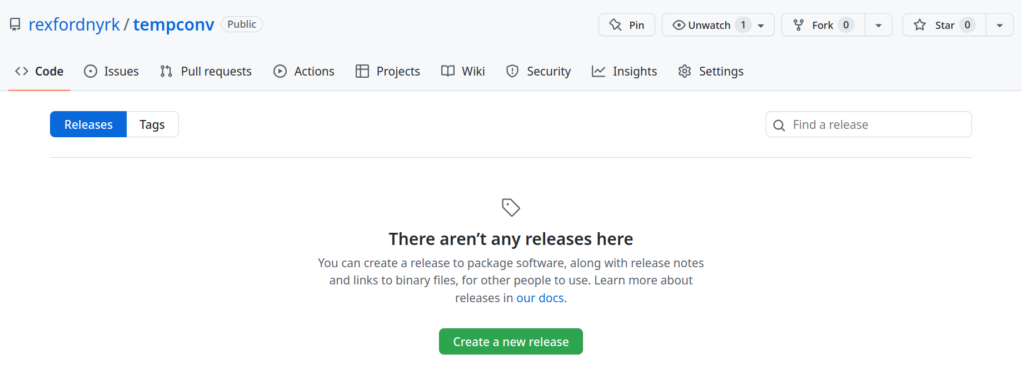 导航到 GitHub 上的版本库,点击 “About” 部分下方的 “Releases“。在 “Releases” 页面,你现在应该什么都没有,点击 “Create a new release“。