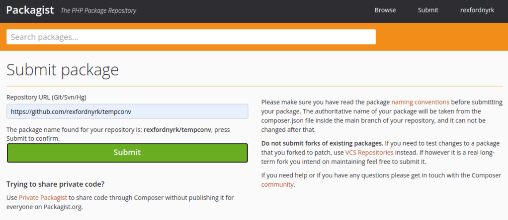 单击 “Submit“,Packagist 会花一点时间设置并发布您的项目。