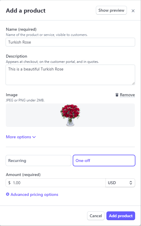- 单击 + Add Product 按钮,打开 Add a product 表单。Stripe 的添加产品页面:
