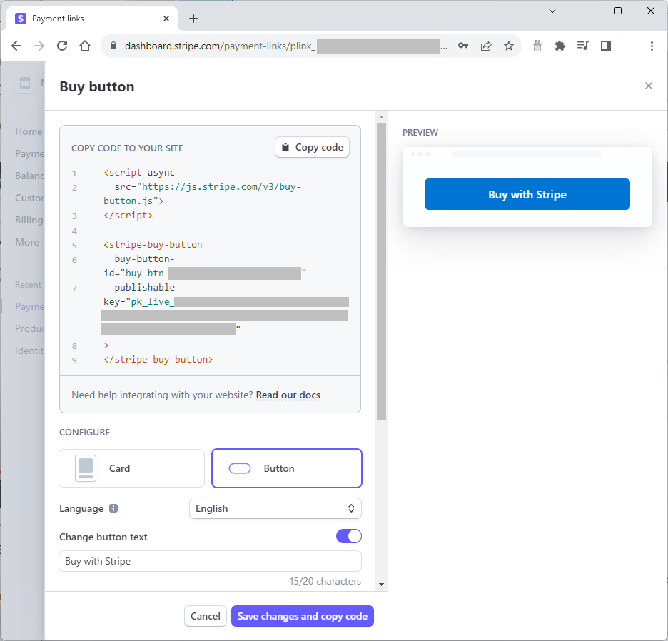 - 当 “Buy button” 按钮面板出现时,你可以查看为结账按钮生成的代码。选择 Button 布局,打开 Change button text,然后在 Change button text 字段中输入 “Buy with Stripe”。然后,单击 Save changes and copy code,将生成的代码复制到操作系统的剪贴板中。Stripe 表单创建购买按钮: