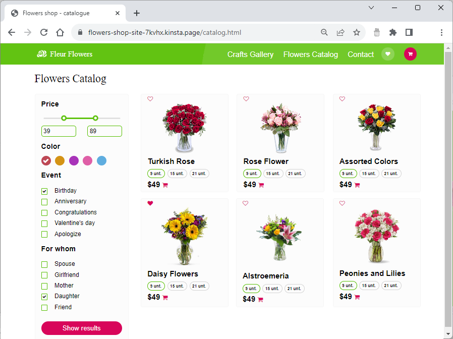 在 Flowers Catalog 页面选择可用产品 – 土耳其玫瑰。