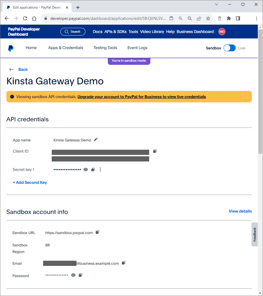 - 注册 PayPal 账户,选择商业账户,因为它更适合本教程。这种类型的账户是测试集成按钮所必需的。注册后,添加企业信息并链接银行账户。账户通过验证后,您可以从 PayPal 开发者门户获取 API 凭据,以便日后使用。