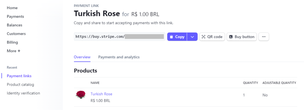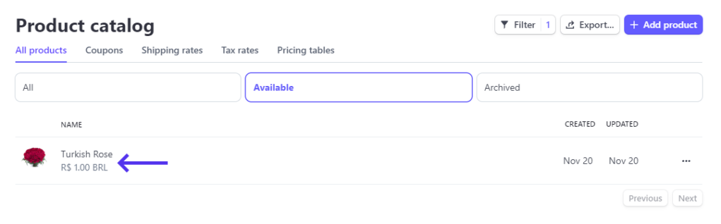 - 在 Product catalog 页面的列表中,选择 Turkish Rose 产品。Stripe 产品目录详情: