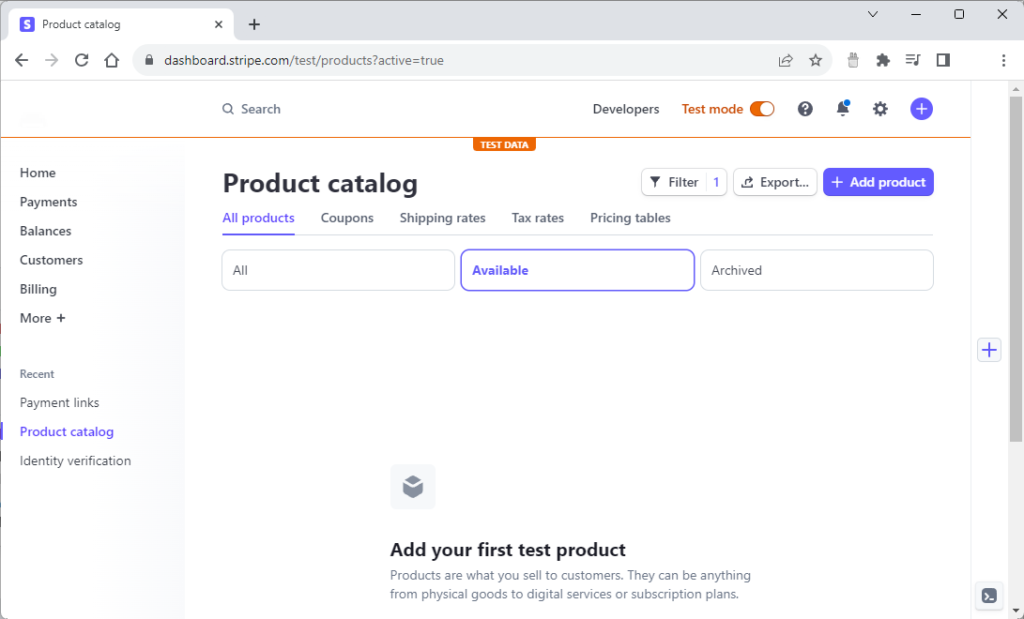 - 在使用 Stripe 结账按钮之前,您可以通过 API 或 Stripe 面板管理产品和价格。要使用仪表板,请打开它,选择 Test mode,然后单击 Product Catalog。Stripe 产品目录页面: