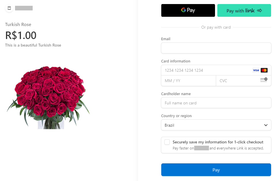 在鲜花网站的 product.html 页面上,您还可以点击 “Buy with Stripe” 按钮来测试 Stripe 结账流程。此操作会触发 Stripe 对话框,其中包含产品详细信息和支付选项,包括 Google Pay、链接和信用卡支付。