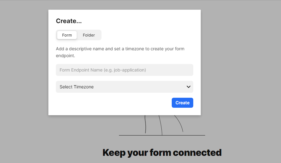 3. 在出现的对话框中,确保选择了 Form。提供一个描述性的端点名称,并选择适当的时区。然后点击 Create。