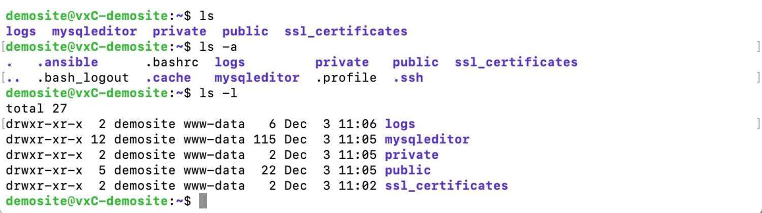 使用 ls 命令获取当前位置的文件和目录列表。你可以在命令中添加更多内容,以获取更多信息:
