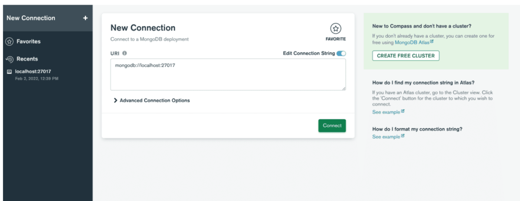 然而,有一个由MongoDB创建的Compass工具(适当地命名为Compass)可以使它更容易。它有一个更好的GUI,并增加了一些功能,如数据可视化、性能分析,以及对数据、数据库和集合的CRUD(创建、读取、更新、删除)访问。