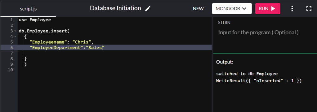 这里,”db “指的是当前连接的数据库。”Employee “是在公司数据库中新创建的集合。