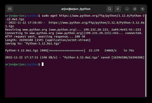 4. 然后,使用 wget 从官方网站下载最新版本的 Python。这里,我下载的是 Python 3.12.0a1。