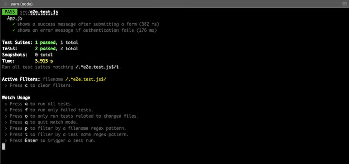 使用 yarn test:e2e 执行测试,获得所有测试通过的简明输出。