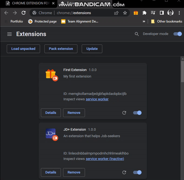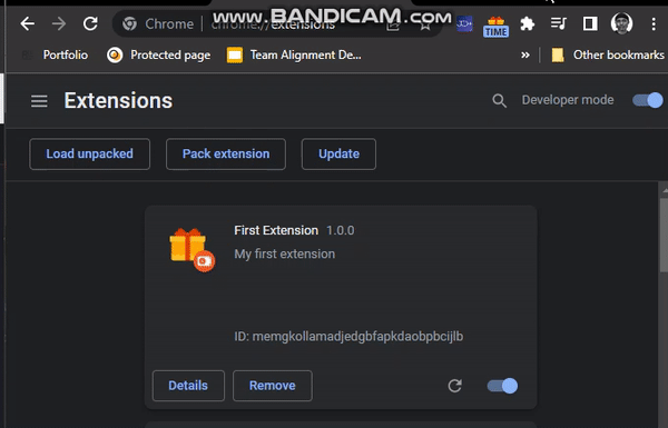 上面的演示显示,添加后台脚本后,当你进入扩展页面并刷新扩展时,就会看到 inspect views:service worker 选项。点击 inspect 时,我们会看到它显示了从 background.js 记录到控制台的信息。