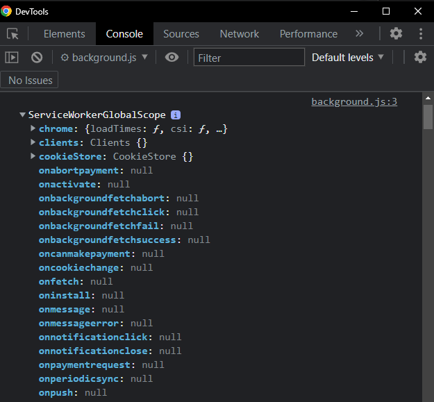 service worker选项时显示的 devtools 环境与检查弹出式页面时看到的 devtools 环境并无不同,只是与我们的弹出式页面相比,我们没有Elements标签,因为后台脚本全部是 Javascript(只有 Javascript 相关的 devtools 可用)。 -