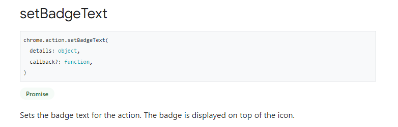 让我们使用 chrome.action API 方法之一来增强扩展的交互性。让我们在显示文本 TIME 的弹出窗口上设置一个徽章。我们将使用 setBadgeText 方法。