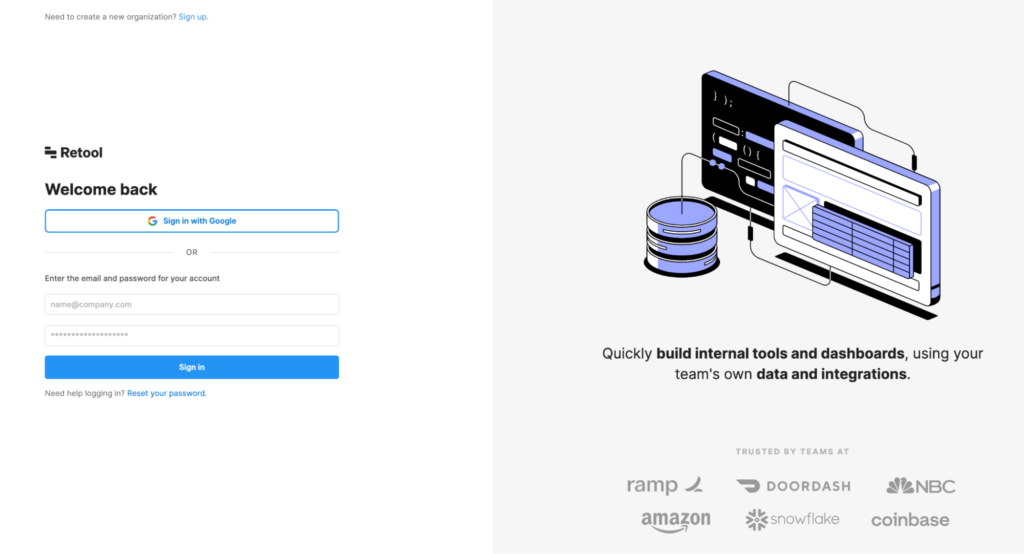 下面是 Retool 的一个注册页面,边上有一个动画和一些标识:
