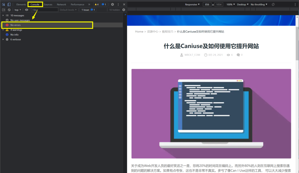 最后,内置调试器是一种更高级的工具,您可以使用它来查看页面的任何错误消息。要访问它,请单击检查元素工具窗口顶部的Console控制台:
