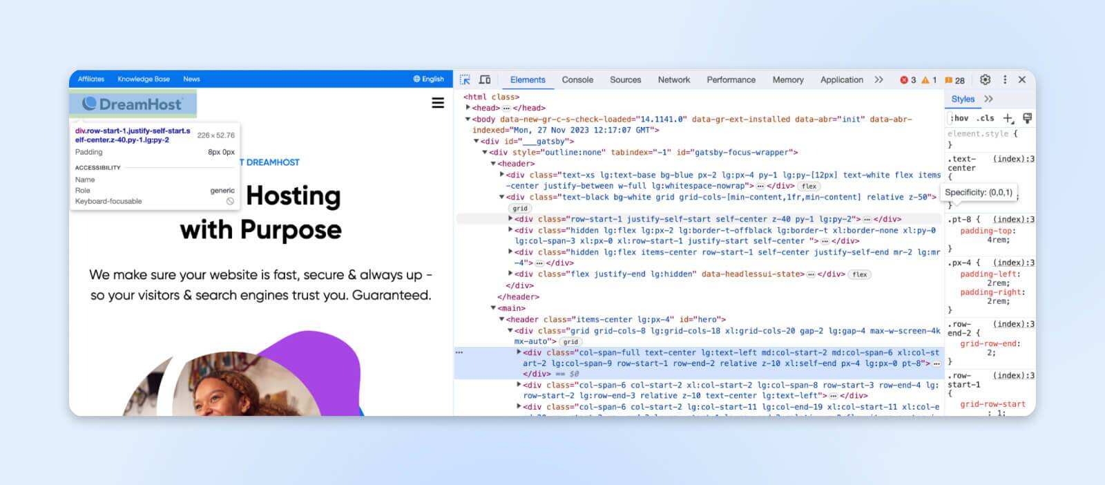 例如,比较字体以确定理想的可读性,或更改按钮颜色以查看它们的外观。有了检查元素工具,您就可以在浏览器中完成这些操作,而无需在 Photoshop 或 Figma 等外部设备中进行更改。