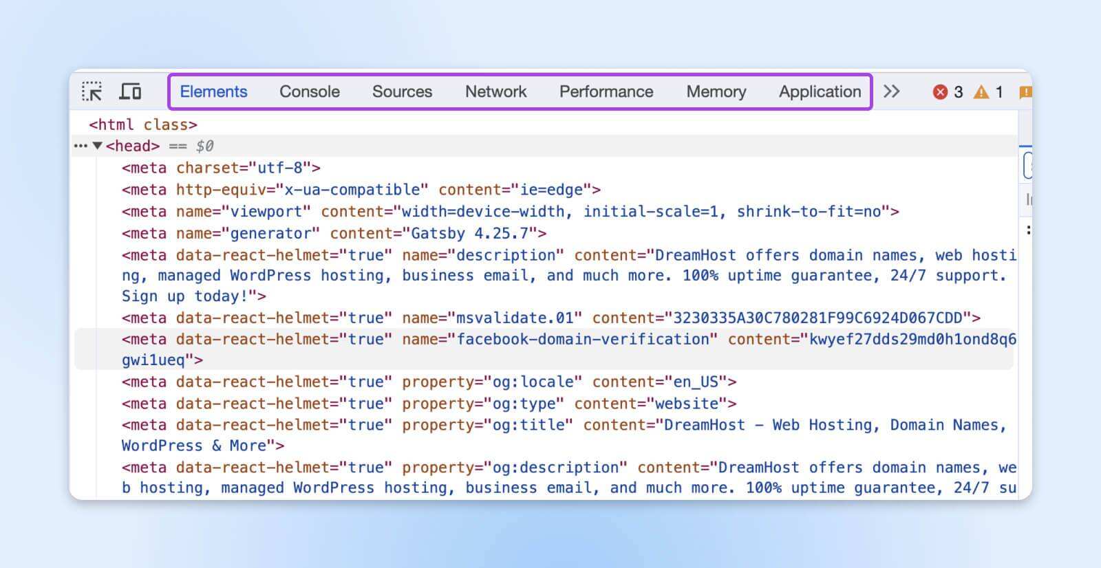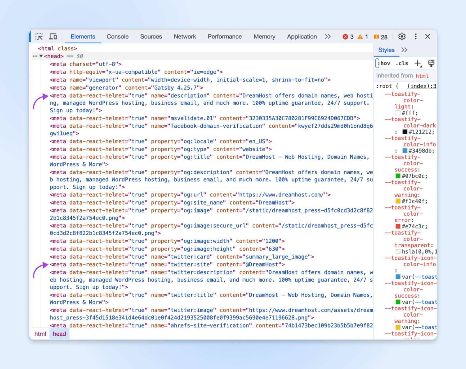 在考虑网页的搜索引擎优化和社交元时,浏览器开发工具提供了重要的洞察力。检查元标签-描述、标题、OG标签-最关键的是影响链接在 SERP 中的显示方式和分享方式。