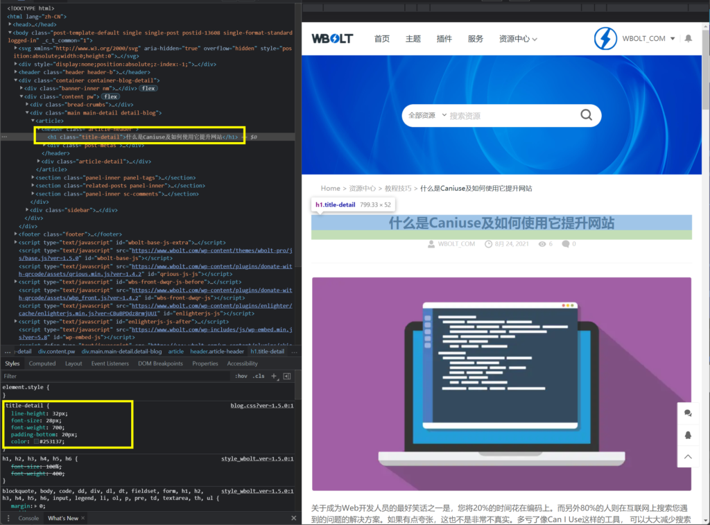 在这里,您可以在我们的博客上看到标题的配色方案、字体、边距等。在详细窗格中,该工具还会突出显示相关代码,以便您可以准确了解发生了什么。单击预览中的元素将更新样式窗格以显示其CSS: