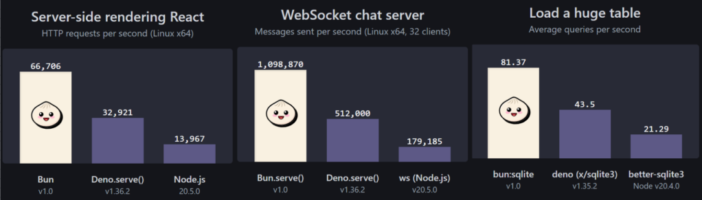 在对 Node.js、Deno 和 Bun 的另一项比较中,Bun 处理并发连接的速度最快。它的每秒请求数也要高得多。在 10 个并发连接的情况下,Bun 每秒可处理 110,000 次请求,而 Node.js 为 60,000 次,Deno 为 67,000 次。根据 Bun 网站的性能基准,Bun.serve() 分别比 Node.js 和 Deno 高出 377% 和 102%。这是一个很大的差距,但将其与特定活动进行比较以进行实际评估始终是一个好主意。