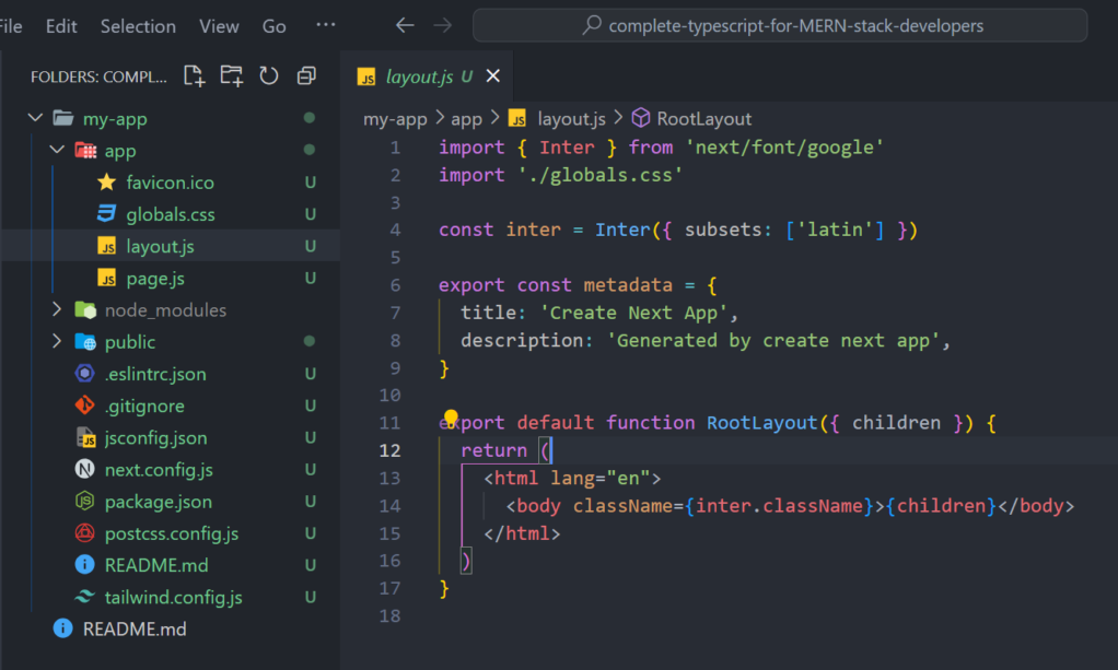应用程序的入口点是新安装的 Next.js 中的 layout.js 文件。因此,正如下面的截图所示,谷歌字体可以导入到该文件中,并应用到包裹应用程序剩余部分的任何可用元素或组件中。