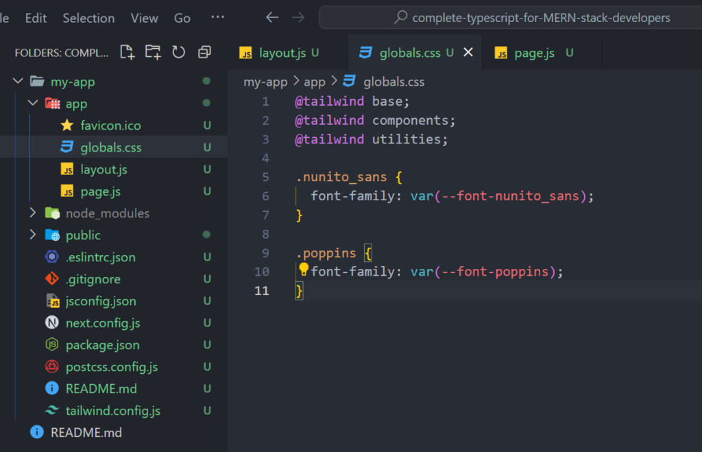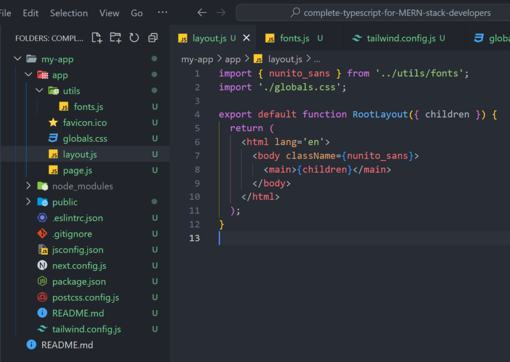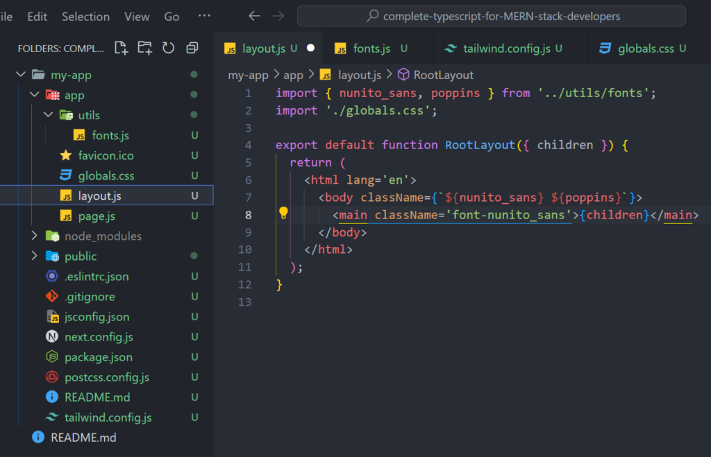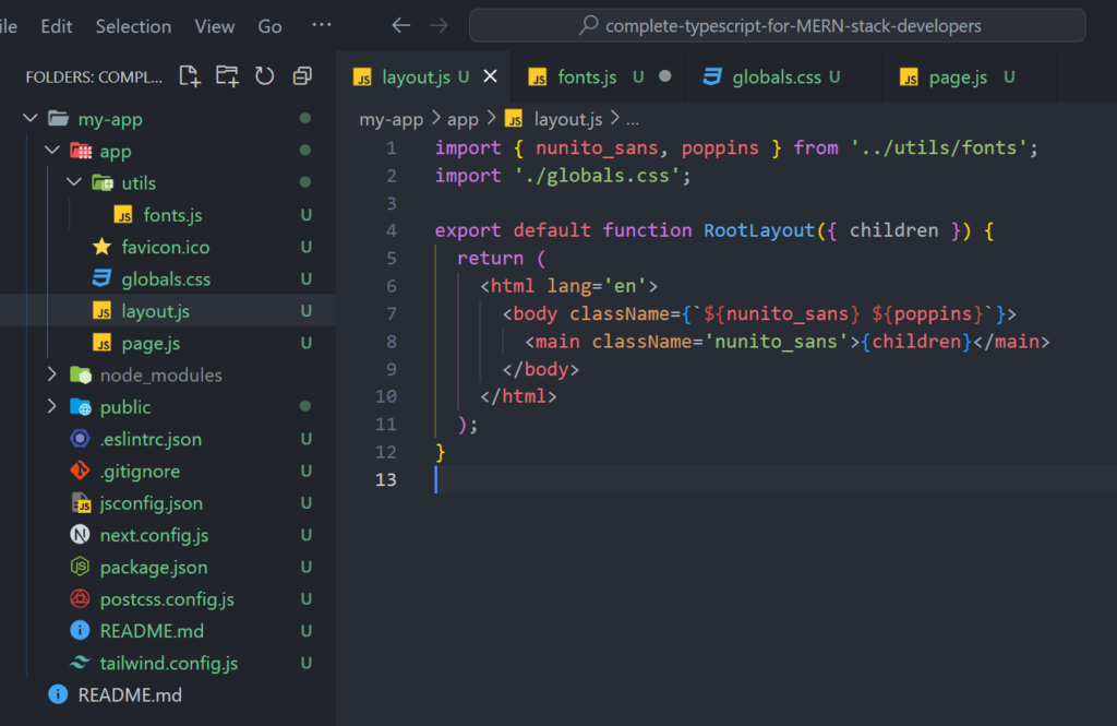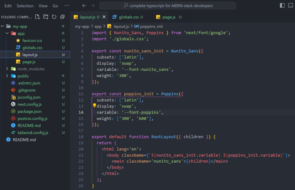 然后:从上面的截图中,我们还可以看到一个 nunito_sans (字体)类是如何附加到作为 children 道具包装器的 main 元素上的。然后,我们需要在 layout.js 文件导入的 CSS 文件中设置该类(以及 poppins 字体的类),如上图第二张截图所示。下面是第三张截图,显示了实现的过程。