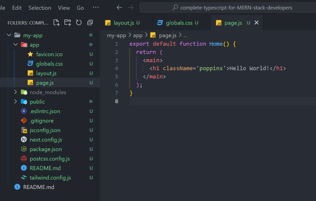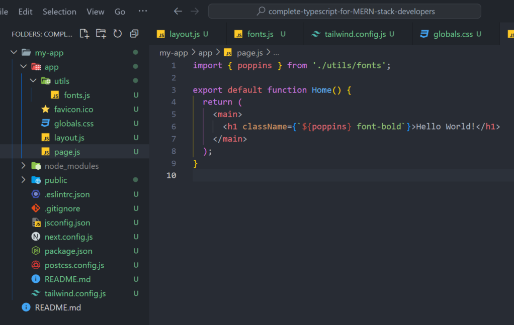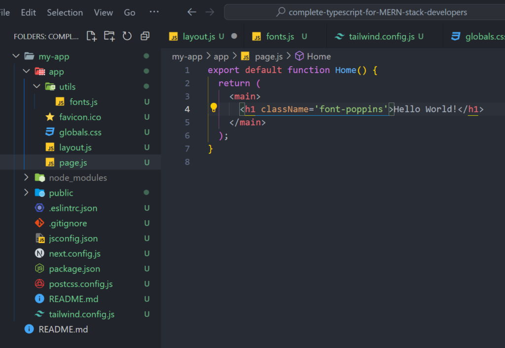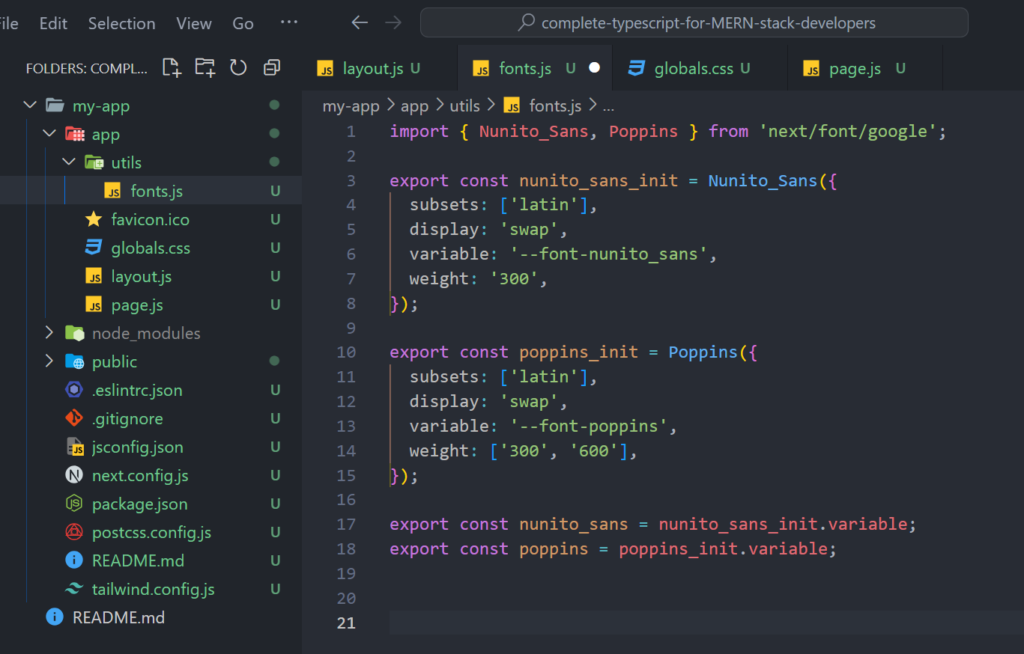 最后:现在,我们可以在应用程序中的任何地方使用字体,就像在上一个方法中所做的那样。但在这种情况下,我们需要在每个字体 class 的前缀加上 “font” 关键字。因此, nunito_sans (字体)类将变为 font-nunito_sans, poppins(字体)类将变为 font-poppins – 如下两张截图所示,分别是 layout.js 文件和 page.js 文件。