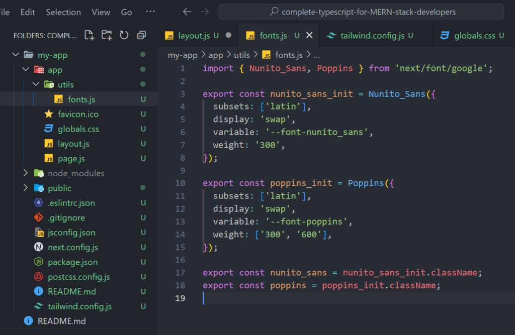 我们的 layout.js 文件看起来就像下面第六张截图所示的那样简单。请仔细观察字体(配置变量)是如何导出为新的 JavaScript 变量,然后导入并用于 layout.js 文件的。