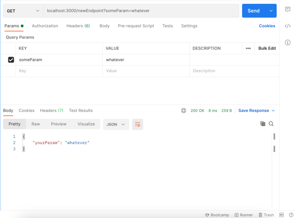 向 localhost:3000/newEndpoint?someParam=whatever 发送 GET 请求,将产生包含字符串 “whatever” 的 JSON 输出。